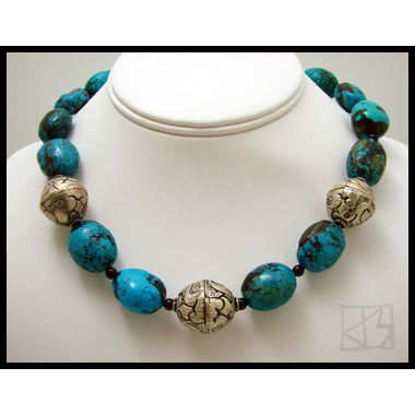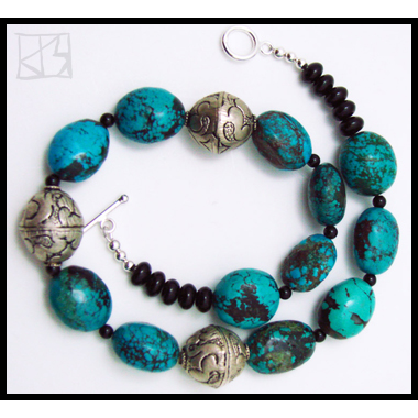 Name: turquoise dragon #2 SALEMaterialsBeads: dragon skin turquoise nuggets Tibetan silver black onyx Clasp: bali sterling toggle Length: 17" $175 | ||||||