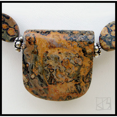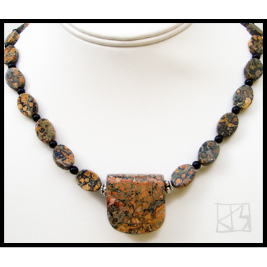 Name: wild cat leopard jasperMaterialsPendant: AAA madagascar leopard jasper Size: Beads: AAA madagascar leopard jasper black onyx bali sterling silver (.925) Clasp: bali sterling j-hook Length: 19" $105 | ||||||