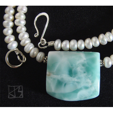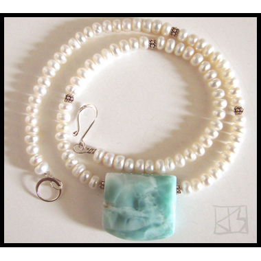 Name: oceans apart (larimar)MaterialsFocal: AA dominican larimar Size: Beads: natural white rondelle pearls bali silver Clasp: sterling j-hook Length: 17" $175 | ||||||
