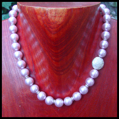 Name: lavender moonMaterialsFocal: sterling silver repousse Size: Beads: genuine South Sea shell pearls bali sterling silver Clasp: sterling J-hook Length: 18.5" $115 | ||||||