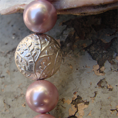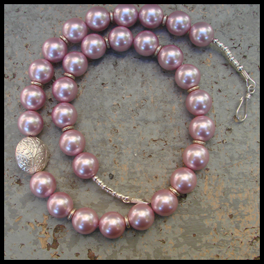 Bali sterling focal embossed with stylized branches and leaves, created by a silver artist in Berkeley, CA; South Sea shell pearls in soft lavender; Bali sterling spacers and clasp |