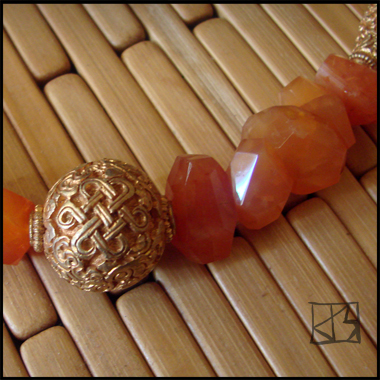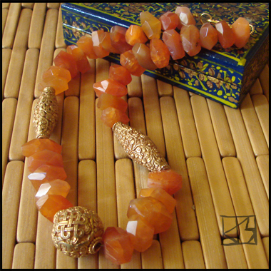 hand carved and cast bronze beads layered with 22kt gold vermeil from Thailand; natural faceted carnelian nuggets from India; Bali vermeil s-clasp |