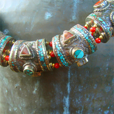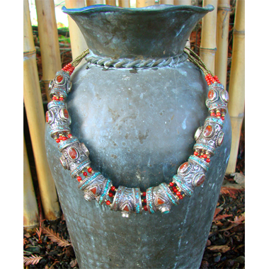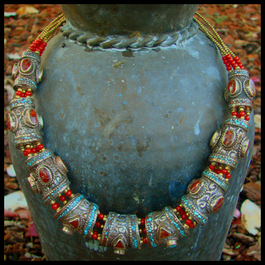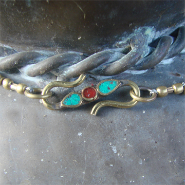 Name: antique nepal #1 SALEMaterialsBeads: natural turquoise, coral, brass small red coral rounds small brass rounds Clasp: coral/turquoise inlay S-hook Length: 22" $525 | ||||||