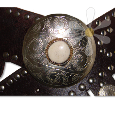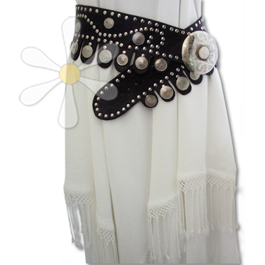 One of our more elaborate and popular styles! Featuring finger-tab "fringe" along the bottom edge decorated with coins (most often authentic, sometimes simulated) and metal studs. The gorgeous handcrafted buckle, created by skilled artisans, is centered with a genuine Moroccan agate cabochon, different on every piece... PERFECT!
