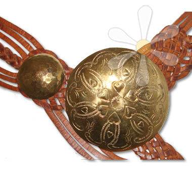 This beautifully handcrafted belt is artisan-made in Morocco of their world famous traditionally tanned cow leather and hammered brass. It's gorgeous whether you wear it low on the hip or as a cinch at your natural waistline. The ASTARTE features gorgeous hand-etched brass discs and intricately braided leather straps. The buckle is the ce ...show more This beautifully handcrafted belt is artisan-made in Morocco of their world famous traditionally tanned cow leather and hammered brass. It's gorgeous whether you wear it low on the hip or as a cinch at your natural waistline. The ASTARTE features gorgeous hand-etched brass discs and intricately braided leather straps. The buckle is the center of attention, a beautifully ornate work of art on its own!