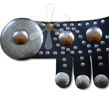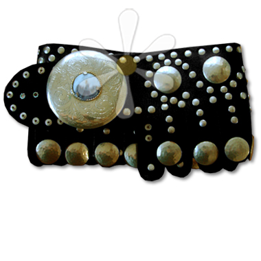 One of our more elaborate styles, the CELESTE features finger-tab "fringe" along the bottom edge decorated with a galaxy of metal discs and studs. These may be all the same, or in patterns of silver, brass and copper -- different on every piece! The disc buckle often has a natural agate stone cabochon, the pattern of which is also, as may...show more