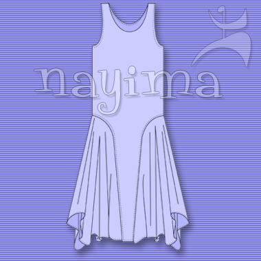 The straight bodice cuts all the way to the hem down the center -- front and back -- dividing a skir...show more |