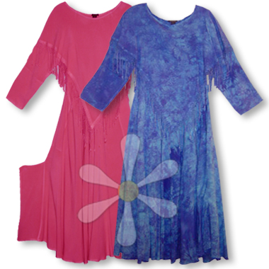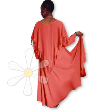 Yards of flowy susti with hand-twisted fringe move with every confident step you take! Not technically a Magic Dress, this still has many styling possibilities: an attached triangular panel can be tied at the shoulder, tossed over either shoulder or both... and adding your favorite brooch will inspire your creativity! The two 18" side sli ...show more Yards of flowy susti with hand-twisted fringe move with every confident step you take! Not technically a Magic Dress, this still has many styling possibilities: an attached triangular panel can be tied at the shoulder, tossed over either shoulder or both... and adding your favorite brooch will inspire your creativity! The two 18" side slits at the hem can also be tied into various effects... it's fabulous frolicking fun!