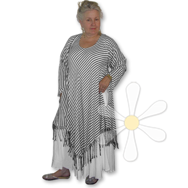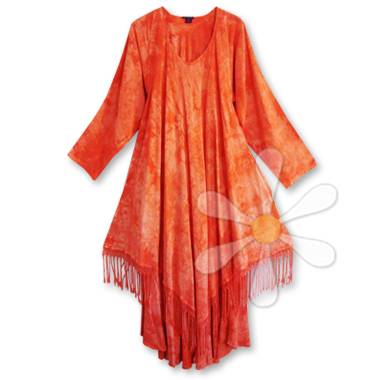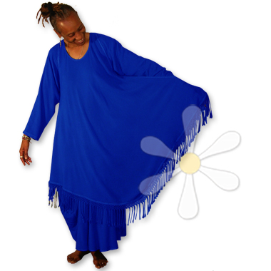 And the details are fantastic: this style, the JADIDA MAGIC DRESS, has 12"-deep side pockets, MILES of flowy fabric, 7" hand twisted and knotted fringe... and the whole thing drapes and flutters like a gypsy dream on so many shapes and sizes! (If you need a less generous cut, see our regular size JADIDA.)