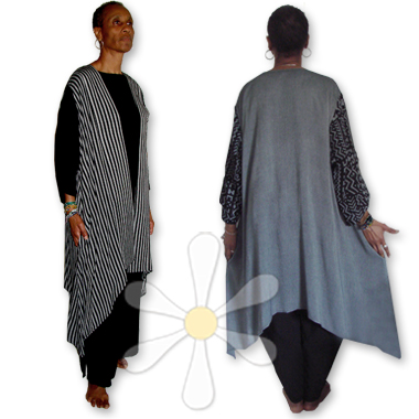 This Central Asian design has simple yet gorgeous lines, an architectural marvel that is flattering on figures tall or petite, willowy or zaftig. The wide center band is doubled to hold its shape and is decorated with fabulous horizontal trapunto. The geometric angles and hemline shaped in a deep crescent is as reminiscent of the Russian steppes as it is of Mali!