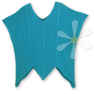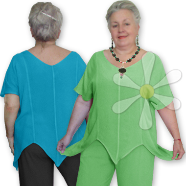 A unique and irresistible top shaped like a capital M with little wings for sleeves! It has a V neckline that's echoed by the fun and flattering pointed hem in front AND back. The cut is loose and flowy on smaller figures and deliciously adorable on the more voluptuous goddess among us... another example of design magic!