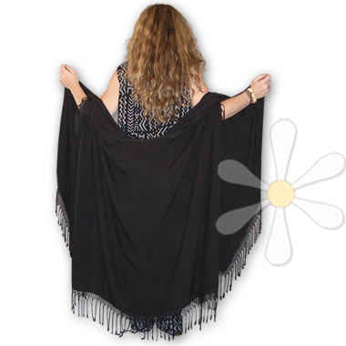 This fluid and dramatic layer flows like heaven and drapes like a dream on any figure, just one of the many delights of this impossibly soft wrap! Superbly crafted in North Africa, it's styled to fall in three main panels like a ruana so that it fits perfectly over your shoulders, unlike more typical shawls. The front cascades in gorgeous ...show more This fluid and dramatic layer flows like heaven and drapes like a dream on any figure, just one of the many delights of this impossibly soft wrap! Superbly crafted in North Africa, it's styled to fall in three main panels like a ruana so that it fits perfectly over your shoulders, unlike more typical shawls. The front cascades in gorgeous ripples formed by additional angular panels, and it's edged with miles of hand-knotted fringe! It's as perfect for cool summer evenings as it is cozy for cold winter nights. Sweep into a room with this on and release your inner WILD WOMAN with drama and style!