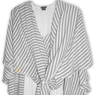 This gorgeous two-layered dress is in true ethnic style, evoking traditional North African, Middle East, and Mediterranean garments—it's part gandourah, part thobe, part caftan, part djellaba—even part burnouse!—designed for goddesses of every culture with the swing of a belly dancer and the elegance of evening wear! And th ...show more This gorgeous two-layered dress is in true ethnic style, evoking traditional North African, Middle East, and Mediterranean garments—it's part gandourah, part thobe, part caftan, part djellaba—even part burnouse!—designed for goddesses of every culture with the swing of a belly dancer and the elegance of evening wear! And the details are fantastic: it has 12"-deep side pockets, MILES of flowy striped susti... and the whole thing drapes and flutters like a gypsy dream on so many shapes and sizes!
