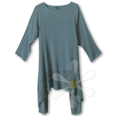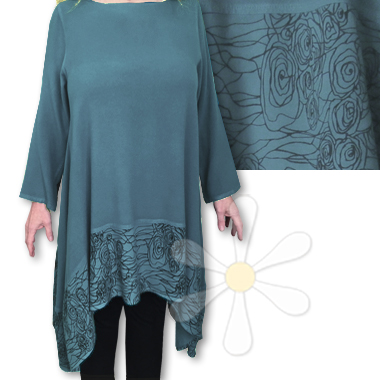 What a dream! This exclusive design has everything we want in a tunic -- even long enough to be worn as a dress on shorter figures! It has long sleeves, a high rounded neckline and long, luxurious sides at the bottom. There's a wide tab of fabric along the hem -- this one in our wonderful abstract pattern!