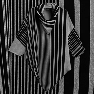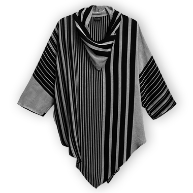 A fluttery design masterstroke! The Amazigh has our signature draped open cowl and its unique V-shaped hem elongates and flatters many figures. The hem comes to a single point, both in front and back, and the sleeves are terrifically roomy. This is always a special style, but in our one-of-a-kind mulstriped susti it amazigh-ing!